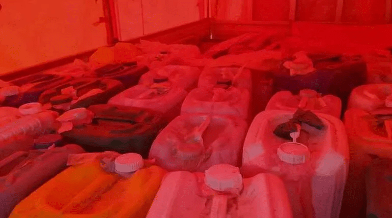 Durante la revisión de los vehículos, los uniformados identificaron a un motorizado sospechoso que intentaba evadir el control. Tras la intervención, se descubrió que el vehículo transportaba 27 bidones de 20 litros de gasolina.