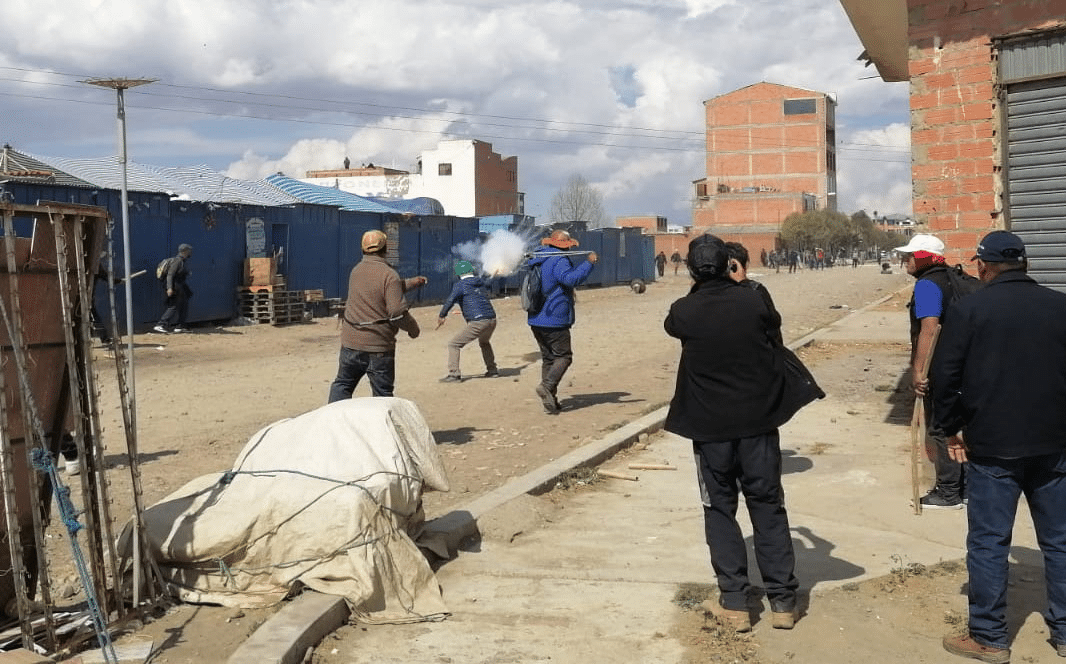 El enfrentamiento se desarrolló la tarde del domingo a pedradas y petardos, cuando afines al ala “arcista” intentaron realizar un cabildo de rechazo a la marcha “evista”, pero fueron rechazados por personas que los acusaron de movilizar a funcionarios y gente del interior del país.