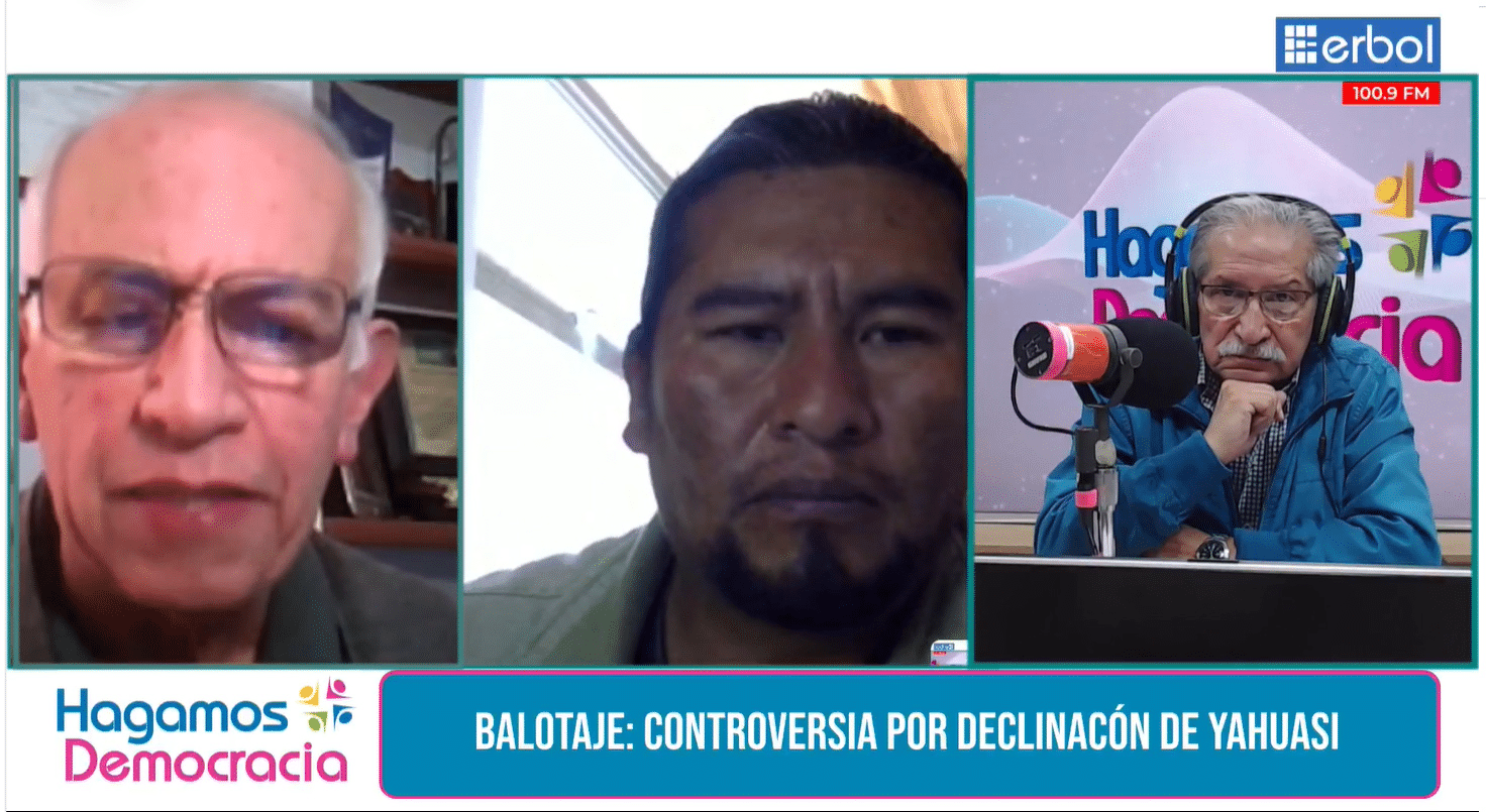 El exvocal del TSE, Antonio Costas, y el exvocal departamental de La Paz, Sabino Chávez, analizaron el tema en el programa Hagamos Democracia de la red Erbol, en medio de la polémica por la declinatoria del partido Nueva Generación Patriótica (NGP) de participar en el balotaje, lo que dejó fuera de competencia a su candidato René Yahuasi y favoreció al postulante oficialista Luis Revilla.