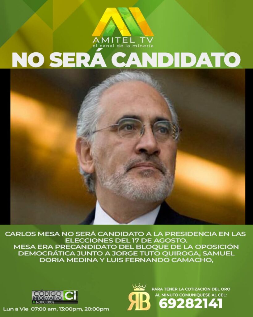 El expresidente de Bolivia y líder de Comunidad Ciudadana, Carlos D. Mesa Gisbert, declinó su candidatura a la presidencia en las elecciones generales del 17 de agosto de este año.