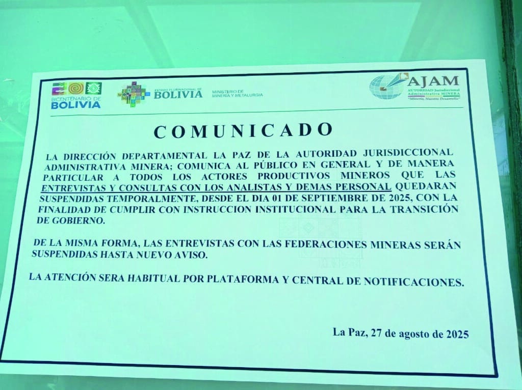 “La Dirección Departamental La Paz de la Ajam comunica a los actores productivos mineros, federaciones mineras y público en general que las entrevistas y consultas con el personal técnico, social y legal quedan suspendidas temporalmente, desde el 1 de septiembre de 2025 hasta nuevo aviso; con la finalidad de cumplir con las acciones de cierre de gestión y transición de gobierno”, señala el aviso pegado en el vidrio del ingreso de la Ajam, que tampoco publicó el mismo en sus redes sociales ni en su portal electrónico.